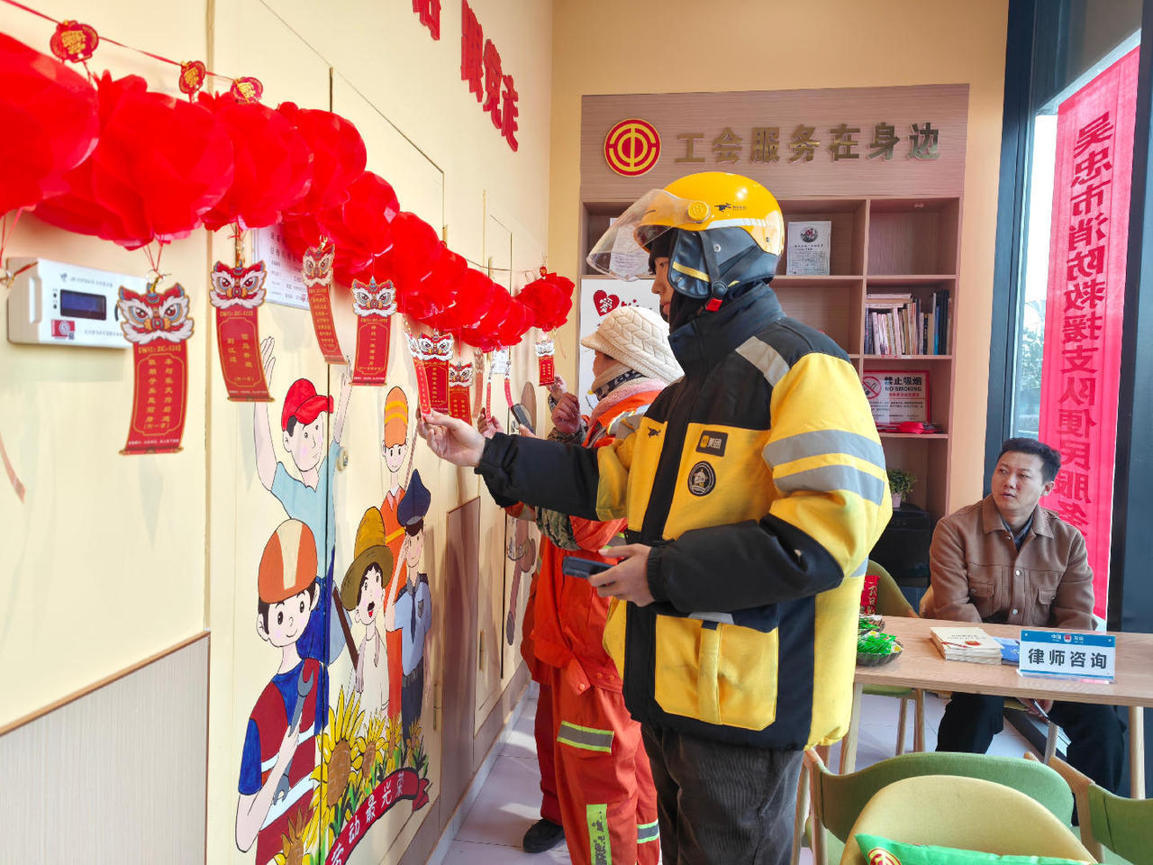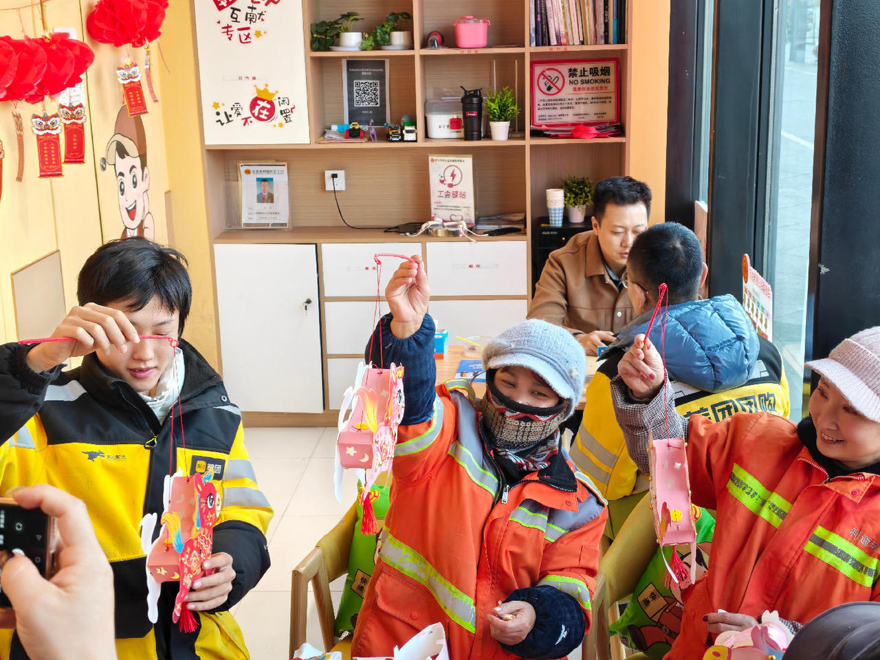 驿站内,红彤彤的醒狮灯笼高高悬挂,每个灯笼下方还缀着工会工作人员精心准备的灯谜。这些装饰元素将原本简约的环境装点得格外红火热闹,整个空间洋溢着浓厚的节日氛围和家的温暖。商圈周边的20余名外卖骑手、环卫工人、快递员等一线劳动者暂时放下手头繁忙的工作,欢聚在驿站,沉浸于猜灯谜、做灯笼、吃汤圆等富有传统民俗韵味的活动中,同时收获了“娘家人”为他们提供的法律咨询服务。