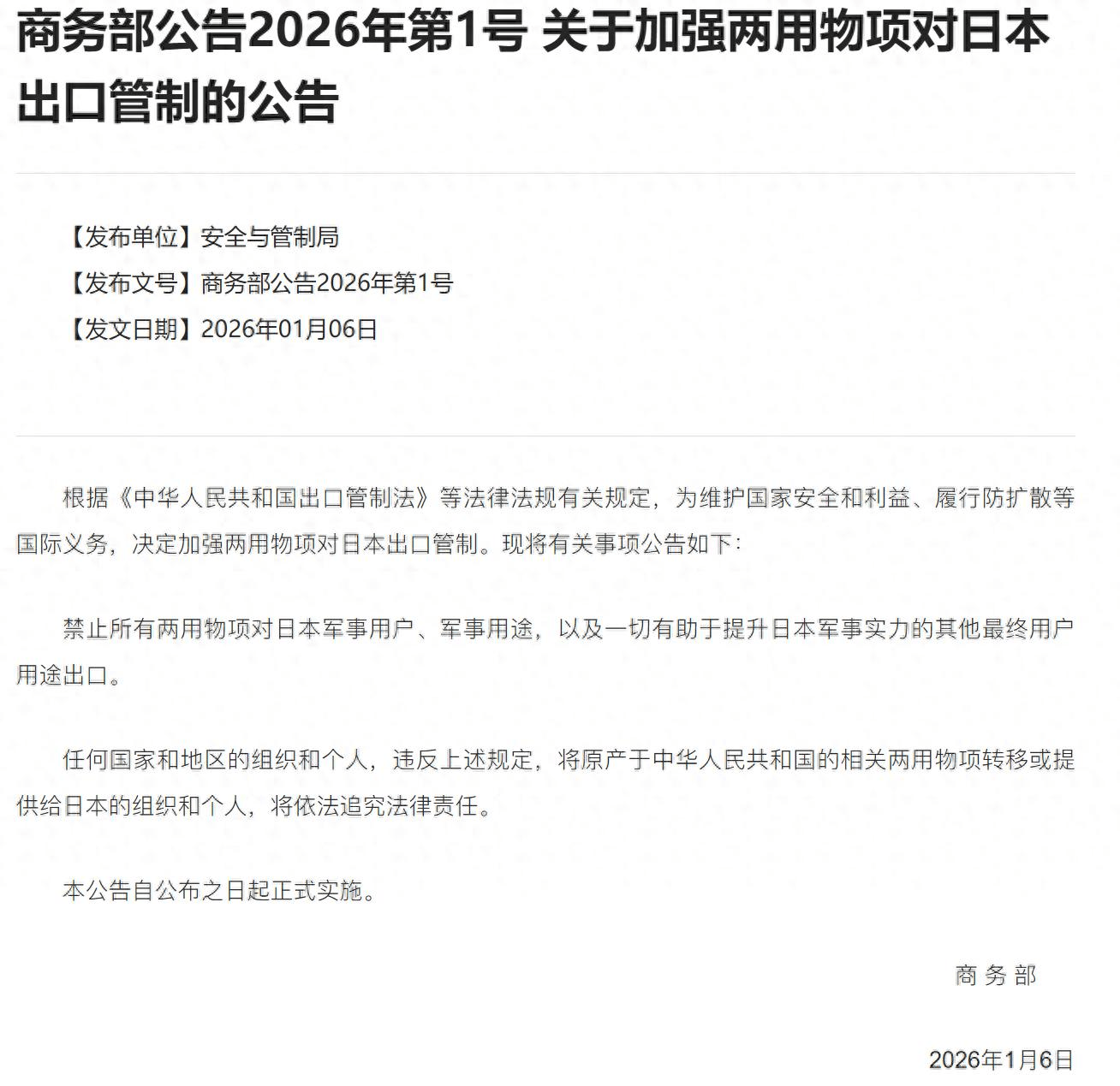 首先,让我们回顾一下事件的起因。2026年1月6日,中国商务部宣布禁止向日本出口所有可能增强其军事能力的“两用物项”,其中包括重稀土等关键材料。这一举措可以看作是中国对日本在国际事务上频频发声、尤其是在台海问题上立场偏颇的一种明确回应。然而,日本的反应却毫不意外:抗议声一浪高过一浪,甚至要求中国撤销制裁,声称这一行为侵害了其国家主权。